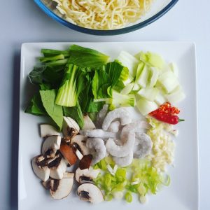 • Add 300g egg noodles (thick yellow noodles works better), pak choy and mushroom slices. (or any veg you like)
